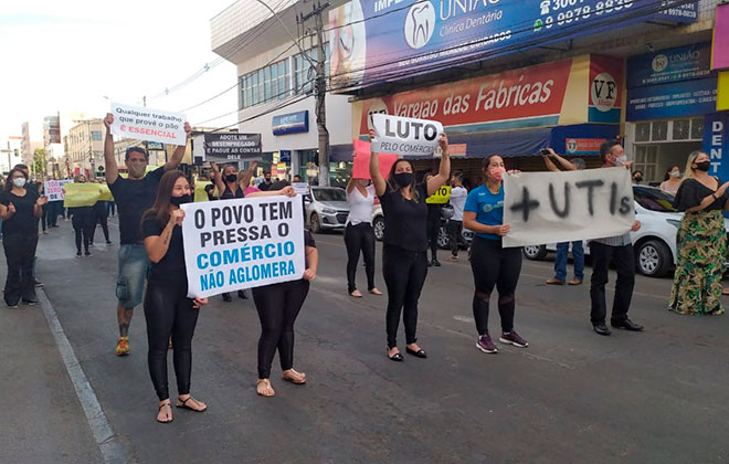 Os manifestantes chegaram a se ajoelhar na calçada na Rua major Gote para pedir que o comércio não seja fechado. Eles também foram para a principal rua da cidade e interromperam o tráfego de veículos para mostrarem o descontentamento com o fechamento das lojas que só deve voltar após o Governo Estadual mudar a região para a Onda Branca.
