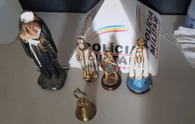 De posse das informações, os policiais acionaram um cerco e bloqueio. O homem foi encontrado na BR 365 já no município de Varjão de Minas. Dentro da caminhonete dele, os policiais encontraram quatro imagens de santos, sendo que uma delas estava sem a cabeça. Também foi localizado o sino que havia sido levado.